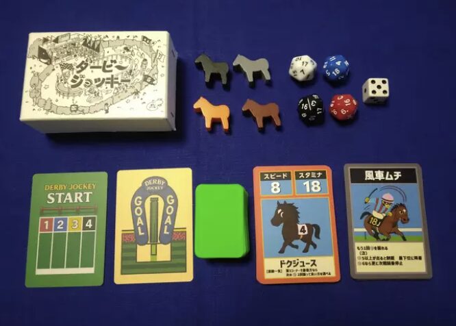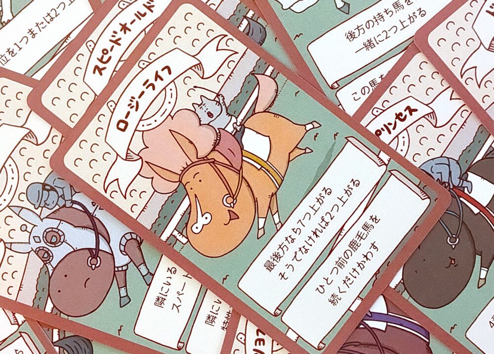 何を隠そうロージーライフの作者も馬のイラストで参加した戦略競馬ボードゲームがこちらのジャンブルダービー。ポケカのように戦略的であり、馬の個性がとても尖っている中量級の競馬ボードゲーム。